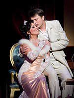 A győri színház sem anyagilag, sem színpad-technikailag nem veheti fel a versenyt a budapesti teátrummal. Úgy tűnik nem is akarta. Megjegyzem, nem is volt rá szükség. Az olykor fölösleges forgások, díszletek nekem nem hiányoztak, amúgy sem szeretem, ha a látvány elvonja a figyelmemet. Elég, ha a fülünket hegyezzük. Ahogy a díszletben, úgy a jelmezekben is nálam Szeged a befutó, és e tekintetben Győr került a képzeletbeli dobogó legalsó fokára. Egy XIX. századi operett a XXI. században is lehet mai, de ehhez el kell szakadni a fehér és rózsaszín ruhácskáktól. Főleg, ha a primadonna (Bellai Eszter) és a szubrett (Mahó Andrea) első pillantásra ugyanolyan ruhában díszeleg.
