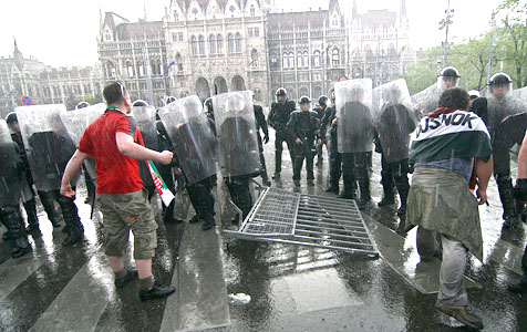 Úgy látszott, az ítéletidő a tüntetők agyát is kikapcsolta, ugyanis a gárdával karöltve kordont bontottak, és nekimentek a rendőrségnek (ez volt a gárda első ilyen akciója). A rendőrségnek sem kellett több: heves szél kapta hátára a könnygázt, érzékeny perceket okozva a randalírozóknak, és sajtó munkatársainak - akik épp vagyont érő munkaeszközeiket próbálták a záporozó H2O negatív hatásaitól megmenteni. A tömeg perceken belül szétszéledt, majd a még mindig tüntetni vágyók a Parlamenthez közeli Nagy Imre szobornál gyülekeztek.