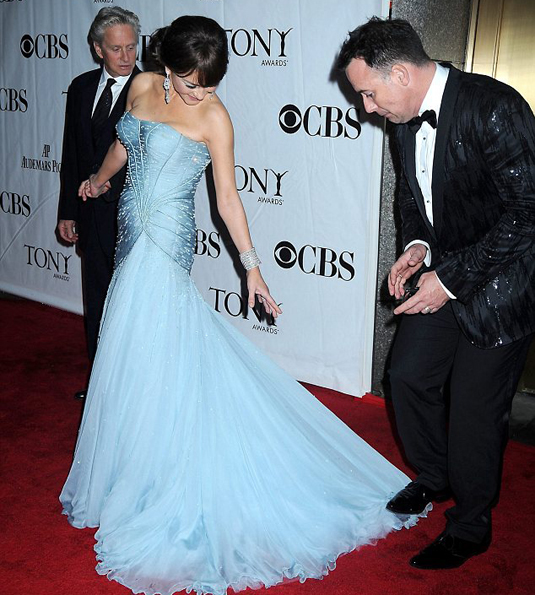 A gyönyörű szép színésznőnek élete párját, Michael Douglast sikerült több száz színészkolléga előtt zavarba hoznia, utána Elton John pasija, David Furnish tépte le róla kisíján a ruhát. Persze ne gondoljuk azt hogy a csodaszép hölgy bájait kívánták mustrálni, egyikük sem szereti a nőket. Puszta véletlenségről volt szó, ugyanis a figyelmetlen David rálépett Catherine földig érő Versace estélyijének uszályára.