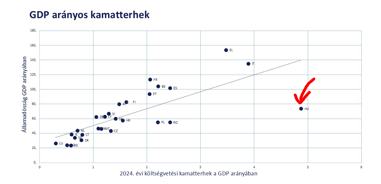 Egy ideig, pár évig lehetővé is tette, a Fidesz kormány évekig vidáman élvezte a csökkenő adósságpálya előnyeit, de aztán szimpla politikai számításból feladta az államadósság ellen meghirdetett „háborúját” és elkeseredett, de gazdasági értelemben hatástalan, csak politikai célokat szolgáló pénzszórásba kezdett. Így 15 évvel később az államadósságunk nagyjából ugyanott van, nem azért vagyunk ugyanis az EU átlaga körül, mert olyan sikeres lett volna a költségvetési gazdálkodás, hanem azért, mert sokan mások hozzánk romlottak.”