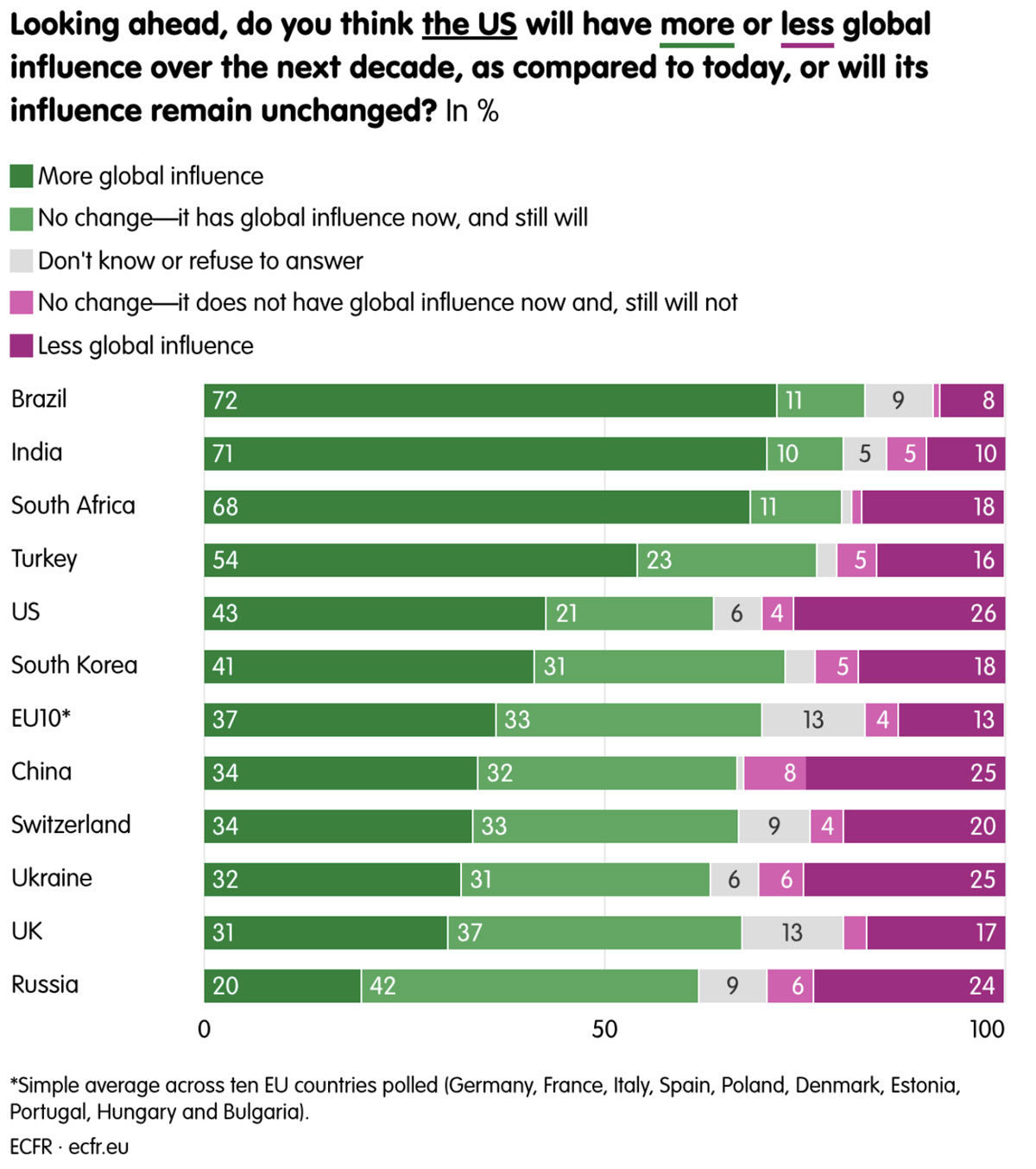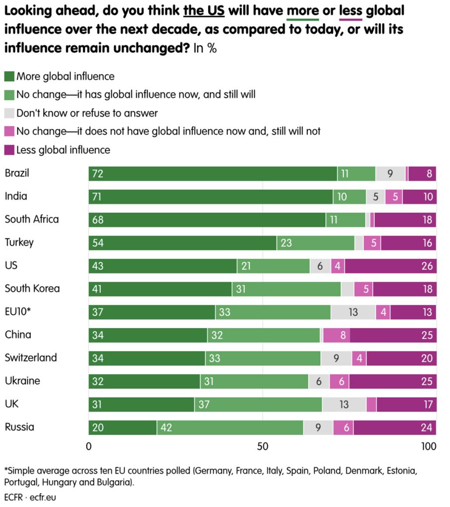 A világ nagy részén az Egyesült Államokat továbbra is globálisan meghatározó szereplőnek tartják, és úgy vélik, hogy a jövőben is fontos marad, ugyanakkor kevesen számítanak befolyásának további erősödésére.