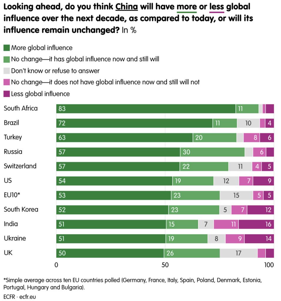 A felmérés szerint a legtöbb országban nemcsak Kína erősödésére számítanak, hanem ezt nem is tartják fenyegetőnek. Kínát csupán Ukrajnában és Dél-Koreában tekinti a többség riválisnak vagy ellenségnek. Ezzel szemben Dél-Afrikában, Brazíliában és Indiában sokan szövetségesként vagy elkerülhetetlen partnerként tekintenek rá.