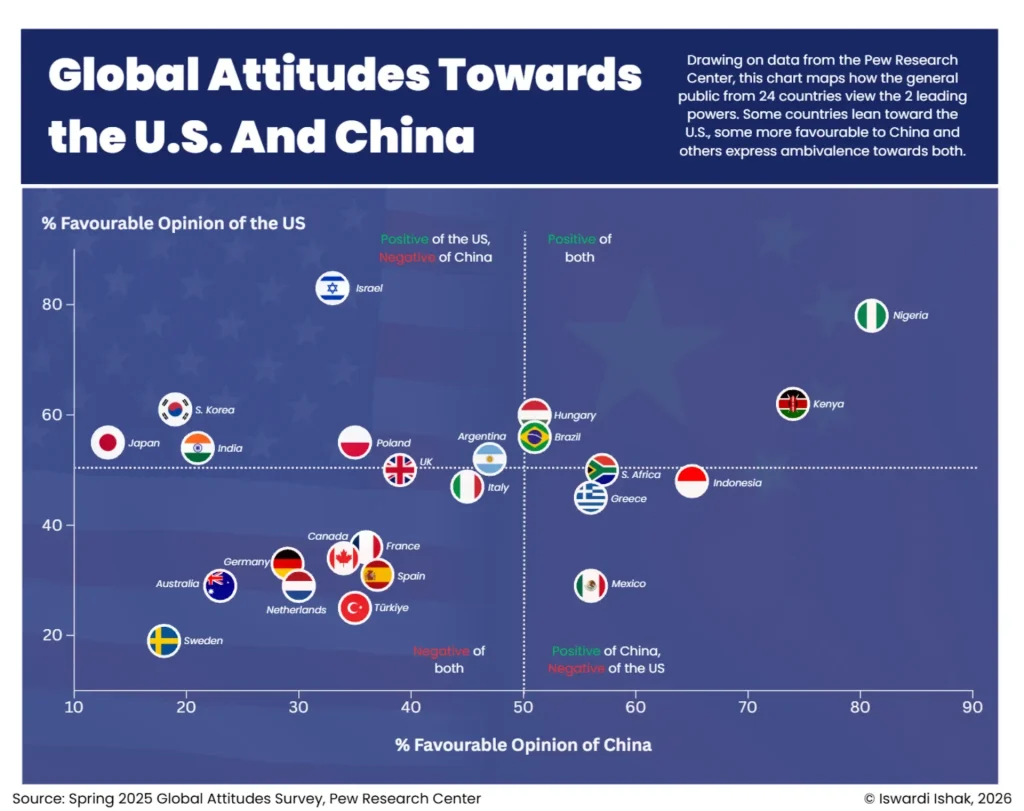 Érdekes, hogy több feltörekvő gazdaság – például Nigéria, Kenya vagy Indonézia – kedvezőbben viszonyul Kínához, mint az Egyesült Államokhoz. Ennek hátterében elsősorban a gazdasági kapcsolatok átrendeződése áll: Kína számos fejlődő országban vált kulcsfontosságú beruházóvá, hitelezővé és infrastrukturális partnerévé. Ezek az államok gyakran tudatosan egyensúlyoznak a nagyhatalmak között, elkerülve az egyoldalú elköteleződést.