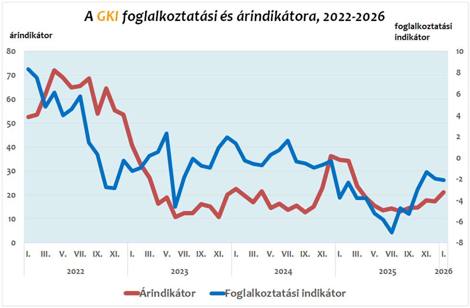 A vállalkozások összesített létszámgazdálkodási várakozását jelző foglalkoztatási indikátor 2026 első hónapjában nem változott a tavaly decemberihez képest. A következő három hónapban a vállalkozások 9%-a készül a létszám bővítésére, míg 12%-a csökkentené azt. Az iparban és az üzleti szolgáltatások területén a létszám bővítésére törekvők vannak többségben az elbocsátásokra készülőkkel szemben. Az építőiparban viszont a leépítést tervezőké a többség.