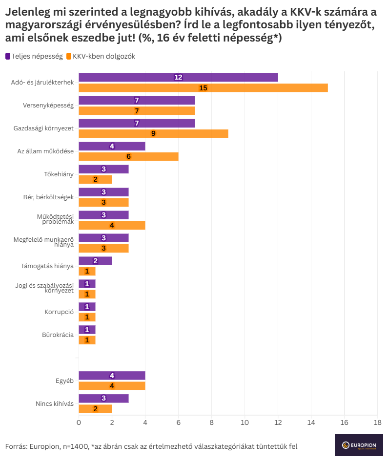 A magyarok szerteágazóan látják a kkv-k előtt tornyosuló legfőbb akadályokat. A megkérdezettek valamivel több mint fele (55%) adott értelmezhető választ az erre irányuló nyitott kérdésre, ezen belül a legtöbben (12%) az adó- és járulékterheket, 7-7% pedig a gazdasági környezetet és a szektor versenyképességét említette.