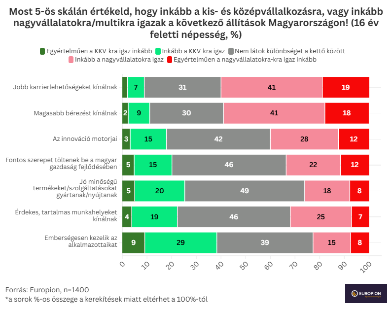 Kiegyenlítettebbek a vélemények az „érdekes, tartalmas munkahelyek” (32% vs. 23%), a magyar gazdaságban betöltött szerepük (34% vs. 20%) és a termékek és szolgáltatásaik minősége (26% vs. 25%) szempontjából. Egyedül a munkavállalókkal szembeni bánásmód az, amelyben a kkv-k „verik” a multikat a magyarok érzékelésében: 38% szerint inkább a kkv-kre és csak 22% szerint a nagyvállalatokra mondható el ez.