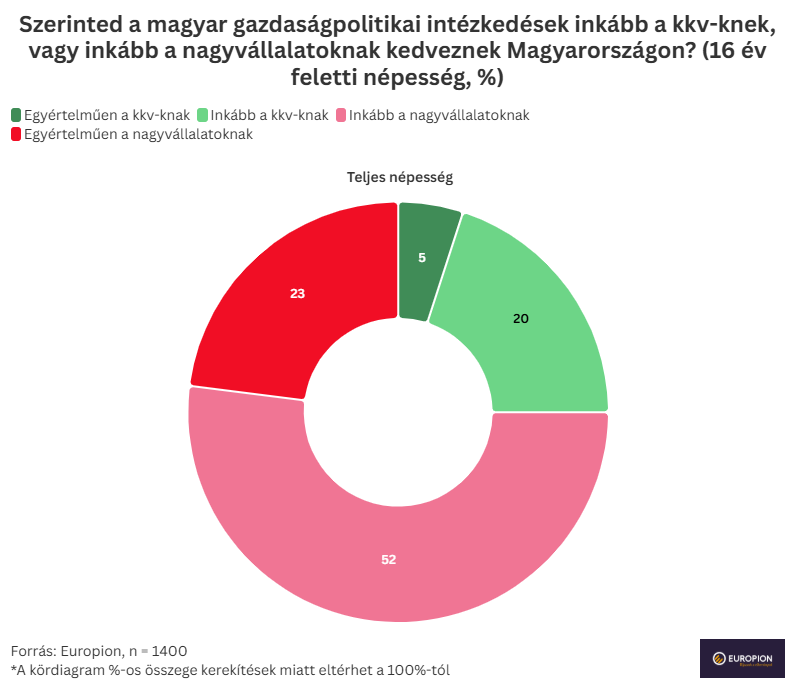 Széles körben érzékelt tendencia továbbá, hogy a magyar gazdaságpolitika egyértelműen inkább a nagyvállalatoknak és kevésbé a kkv-knak kedvez. A teljes népesség háromnegyede osztja az első, és csak negyede az utóbbi álláspontot szinte demográfiai csoporttól és munkahelytől függetlenül.