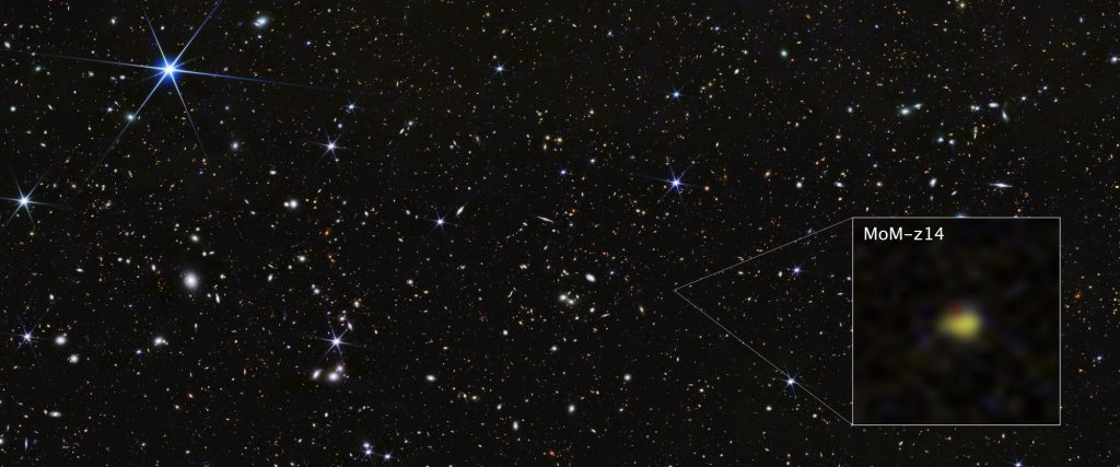A NASA bejelentése szerint a James Webb űrteleszkóp az eddigi legtávolabbi ismert galaxist azonosította. A MoM-z14 nevet kapott égitest fényét mintegy 13,5 milliárd évig tartó utazás után érzékelte a teleszkóp, vagyis a kutatók a világegyetemet szinte közvetlenül a „kozmikus hajnal”, az első csillagok és galaxisok kialakulásának időszakában figyelhetik meg.