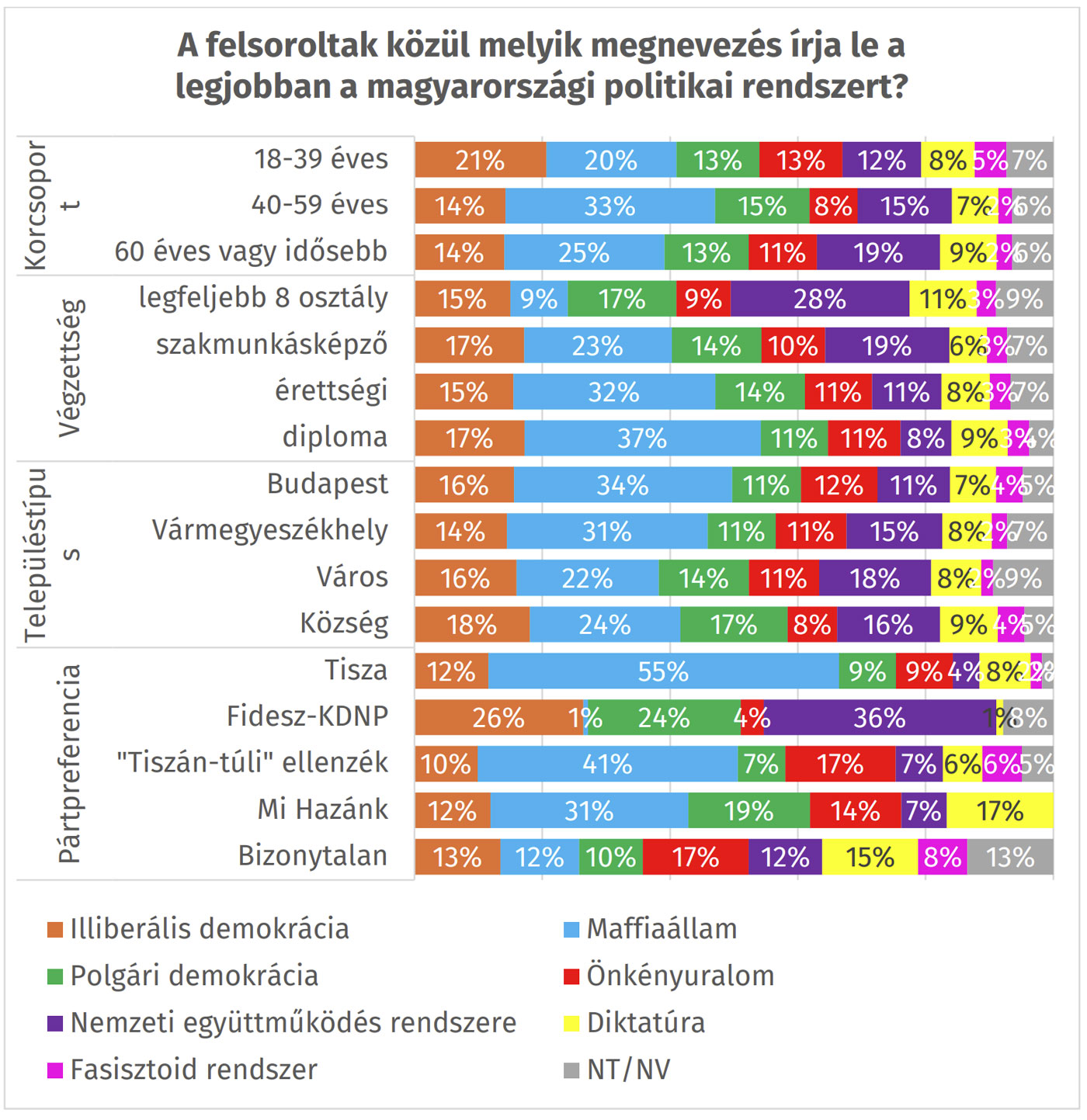 A Tisza Párt támogatóinál viszont elsöprő fölénnyel vezet a „maffiaállam” meghatározás: 55 százalékuk ezt tartja a legtalálóbbnak. A Tiszán kívüli ellenzéki szavazók körében is ez dominál, 41 százalékos aránnyal. A Mi Hazánk támogatóinál szintén a „maffiaállam” áll az első helyen, de náluk a „polgári demokrácia” is viszonylag magas támogatást kapott.