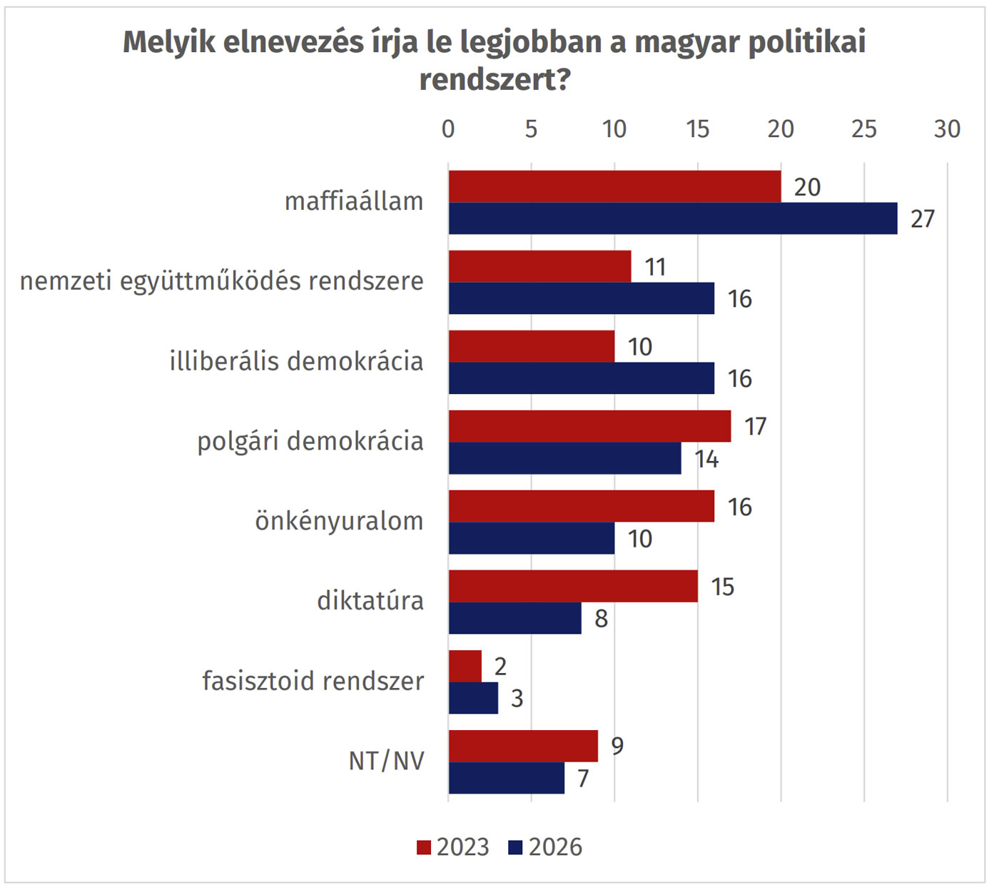 A korábban gyakran használt, keményebb minősítések látványosan visszaszorultak. Az „önkényuralom” aránya 16-ról 10 százalékra csökkent, a „diktatúra” kifejezés pedig 15-ről mindössze 8 százalékra esett vissza. A „fasisztoid rendszer” továbbra is a legritkábban választott meghatározás.