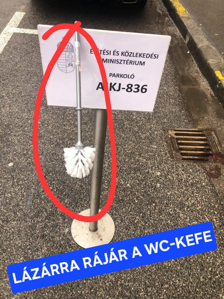 Lázár János jócskán elszabadította az indulatokat a cigányokat vécépucolással összefüggésbe hozó mondatai után – finoman szólva is visszafelé sültek el. Borítottak már a kastélya elé egy teherautónyi vécékefét, készítettek őt ábrázoló vécékefetartót – ebből egy vasúti mosdóba is jutott -, ebből el is árverezik az első modellt, aminek licitje már bőven 2 milló forint felett jár. És most valaki egy vécékefét akasztott Lázár minisztériumi parkólehelyét jelző táblájára is, az Építési és Közlekedési Minisztériumnál. A fotót Márki-Zay Péter osztotta meg, az alábbi tréfás megjegyzéssel: „Lázárra rájár a wc-kefe”.