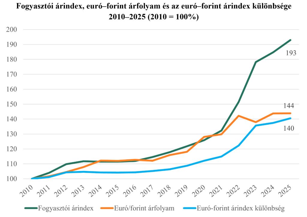 Eközben az euró mintegy 45 százalékkal erősödött a forinthoz képest: a 2010 körüli 275-ös éves átlagárfolyam közel 400-ra emelkedett tizenöt év alatt. Ez a tartós leértékelődés érdemben hozzájárult a hazai árszint növekedéséhez.
