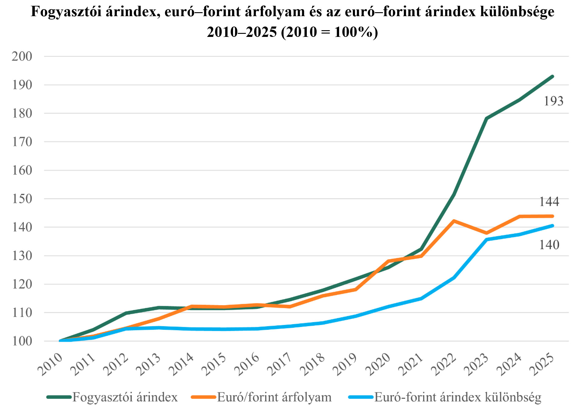 Magyarországon a fogyasztói árindex 2010 óta közel megkétszereződött, miközben az eurózónában az emelkedés mindössze 38 százalék volt. Ez önmagában azt jelenti, hogy változatlan árfolyam mellett a hazai vállalatok nemzetközi versenyképessége jelentősen romlott volna, hiszen működési költségeik euróban mérve jóval gyorsabban emelkedtek volna, mint külföldi versenytársaiké.