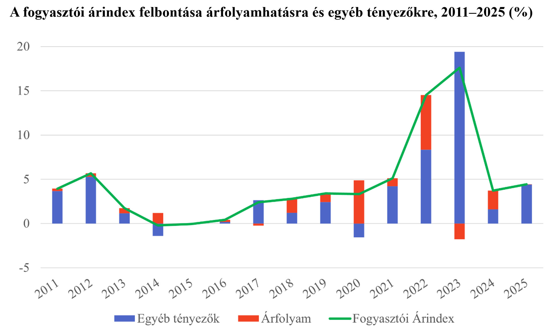 2024-ben a 3,7%-os fogyasztói árindex emelkedésból 1,6 százalékpontot a forint gyengülése okozott. Mindez jól mutatja, hogy egy olyan nyitott gazdaságban, mint a magyar, az árfolyam hatása jelentős az árszintre.