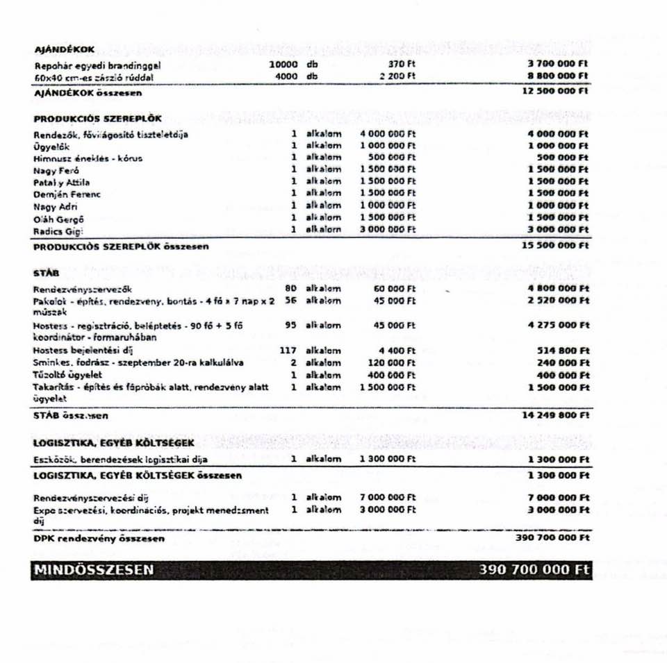 A végüsszeg 390 millió 700 ezret kóstált. Csak a rendezvényszervezés díja 7 millió forint volt, míg a fellépők fejenként 1-1,5 millió forintért léptek fel.