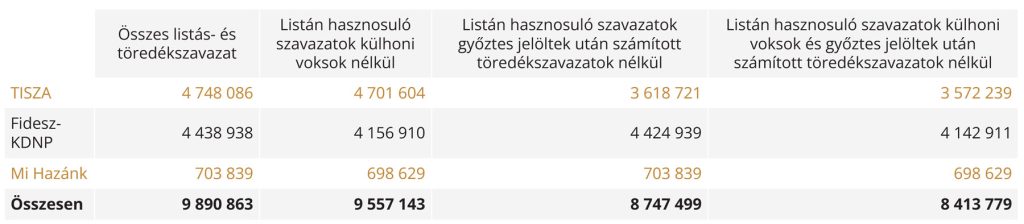 A számítások a szavazatok 99,99 százalékának megszámlálása után, 2026. április 18. 17 órai állapot szerint készültek. Elhanyagolható változások azóta bekövetkezhettek, de ez nem befolyásolja érdemben a kalkulációt.