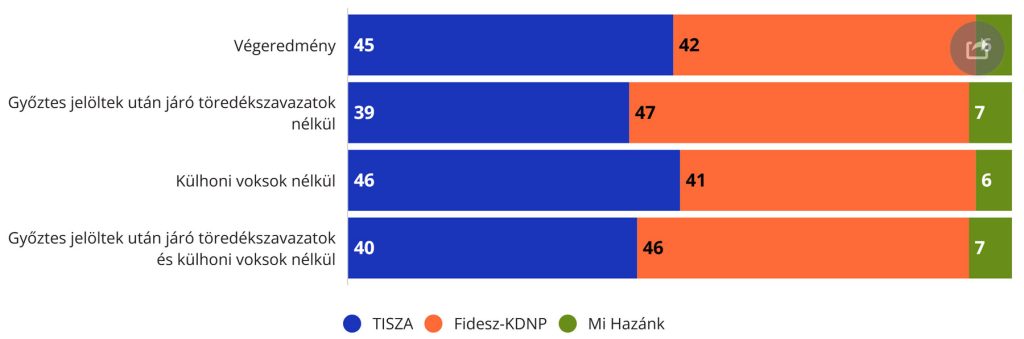 A Fidesz az elmúlt két választáson bő 900 ezer, 2014-ben pedig 765 ezer győztes jelöltek után járó töredékszavazatot gyűjtött be. Ennél is figyelemreméltóbb, hogy míg győztes jelöltjeik után a Fidesz ellenfelei 2014-ben bő 22 ezer, 2018-ban közel 60 ezer, 2022-ben bő 86 ezer töredékszavazatot gyűjtöttek, a Fidesz idei 10 egyéni kerületi győztesének többsége annyira szűk különbséggel nyert, hogy mindössze 13999 töredékszavazatot csaphattak hozzá pártjuk listájához. Idén tehát a Fidesz 10 jelöltje átlagosan 1400 szavazatkülönbséggel nyert, míg a TISZA 96 jelöltje átlagosan 11764-gyel.