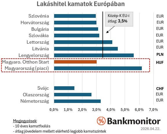 A Bankmonitor által összegyűjtött európai adatok egyértelmű képet adnak: a piaci alapú magyar lakáshitelkamat (kb. 6,2%) közel duplája a régiós átlagnak (3,5%). Szlovénia, Horvátország, Bulgária és Szlovákia 3% körüli kamatokon ad lakáshitelt, Németország és Olaszország is 3% alatt–körül hitelez. A magyar piaci szint csak a lengyelhez hasonlítható – de még a lengyel (5,6%) is alatta van a magyarnak.