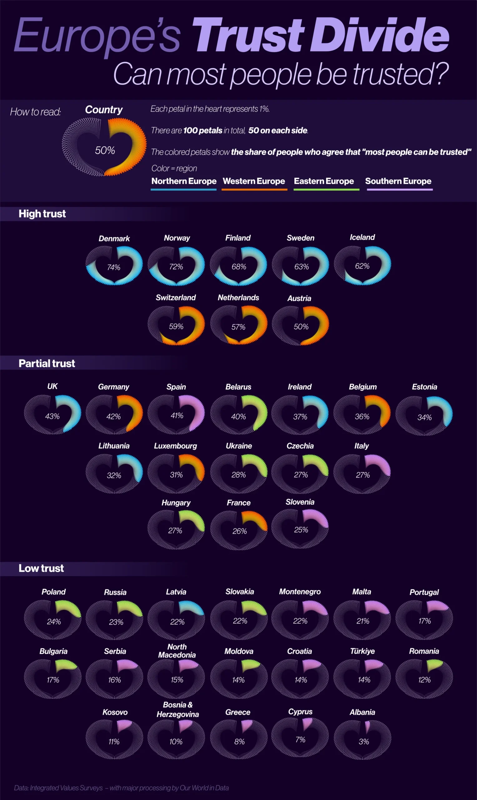 Ezzel szemben Dél- és Kelet-Európában jóval alacsonyabb a bizalom szintje. A Balkán számos országában kevesebb mint minden ötödik ember gondolja úgy, hogy mások megbízhatók. A legalacsonyabb értéket Albánia mutatja, ahol mindössze 3 százalék nyilatkozott bizalomról.